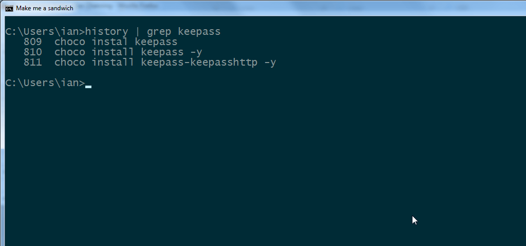 Martin Ridgers’ Clink is an awesome tool to behold. That adds the correct ! command to the DOS command prompt. Buuuuuuut… it doesn’t include a history command. So save the above history.bat file to C:\Windows\System32\history.bat (it doesn’t have to rely on GNU Tools / Git) and uncomment history_file=%localappdata%\clink\.history.