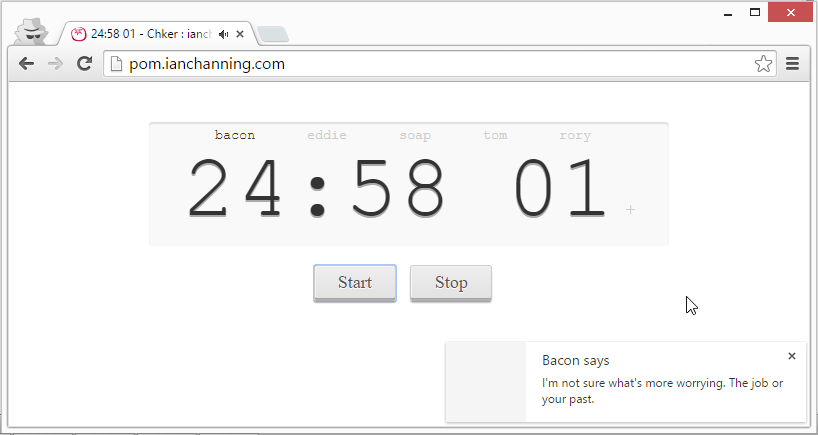 Thirdly there’s a start and stop. Possibly this flies against what a Pomodoro timer should do. However any timer I have I want to be able to start/stop/reset. That’s just what a timer should do, it’s annoying if it doesn’t.
